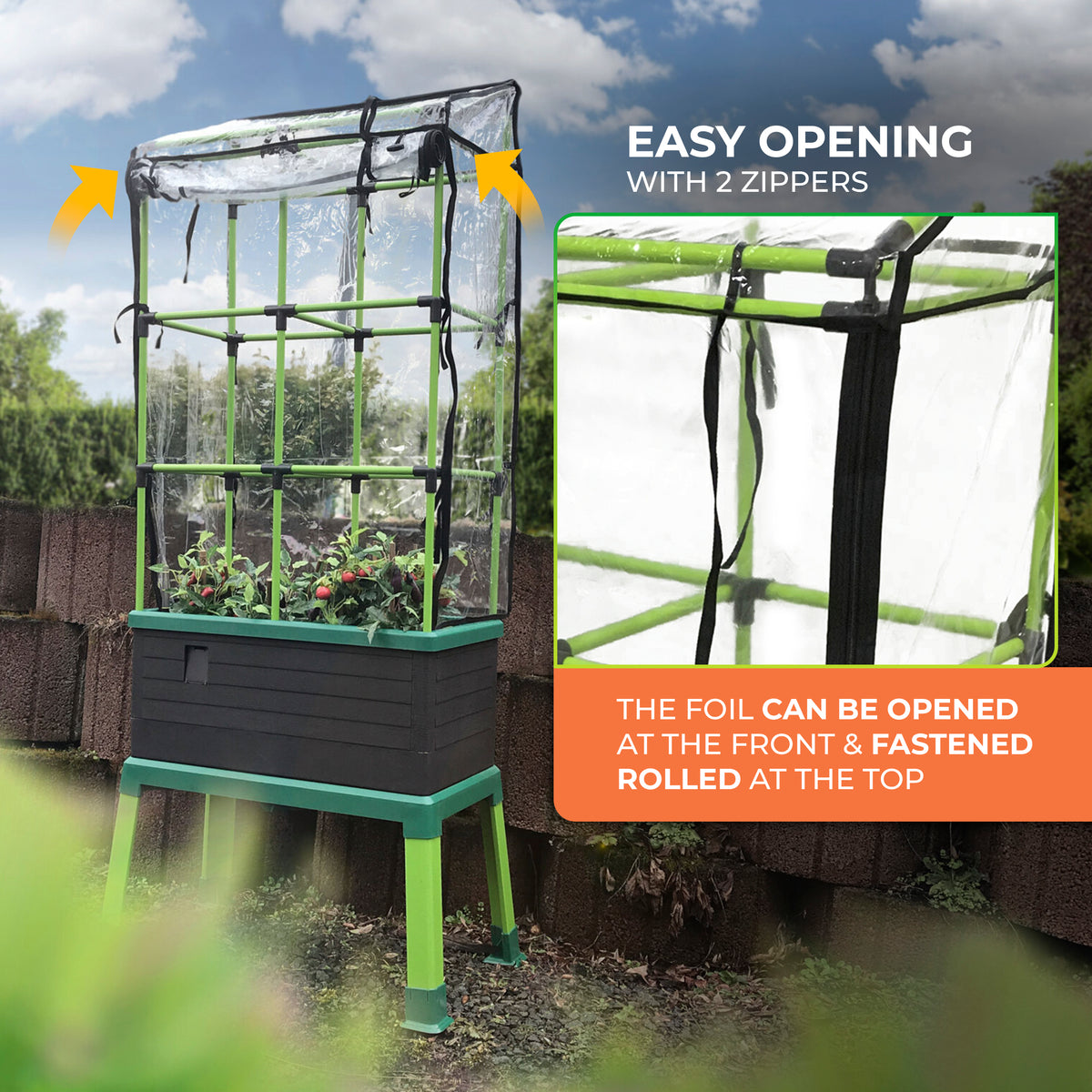 Easy Access and Ventilation Worried about the hassle of constantly removing the cover to tend to your garden? We've got you covered! Literally. The CityJungle Cover features a convenient roll-up front panel, allowing you easy access to your plants whenever you need it. Plus, the built-in ventilation system ensures a healthy airflow, preventing overheating during hot summer days.