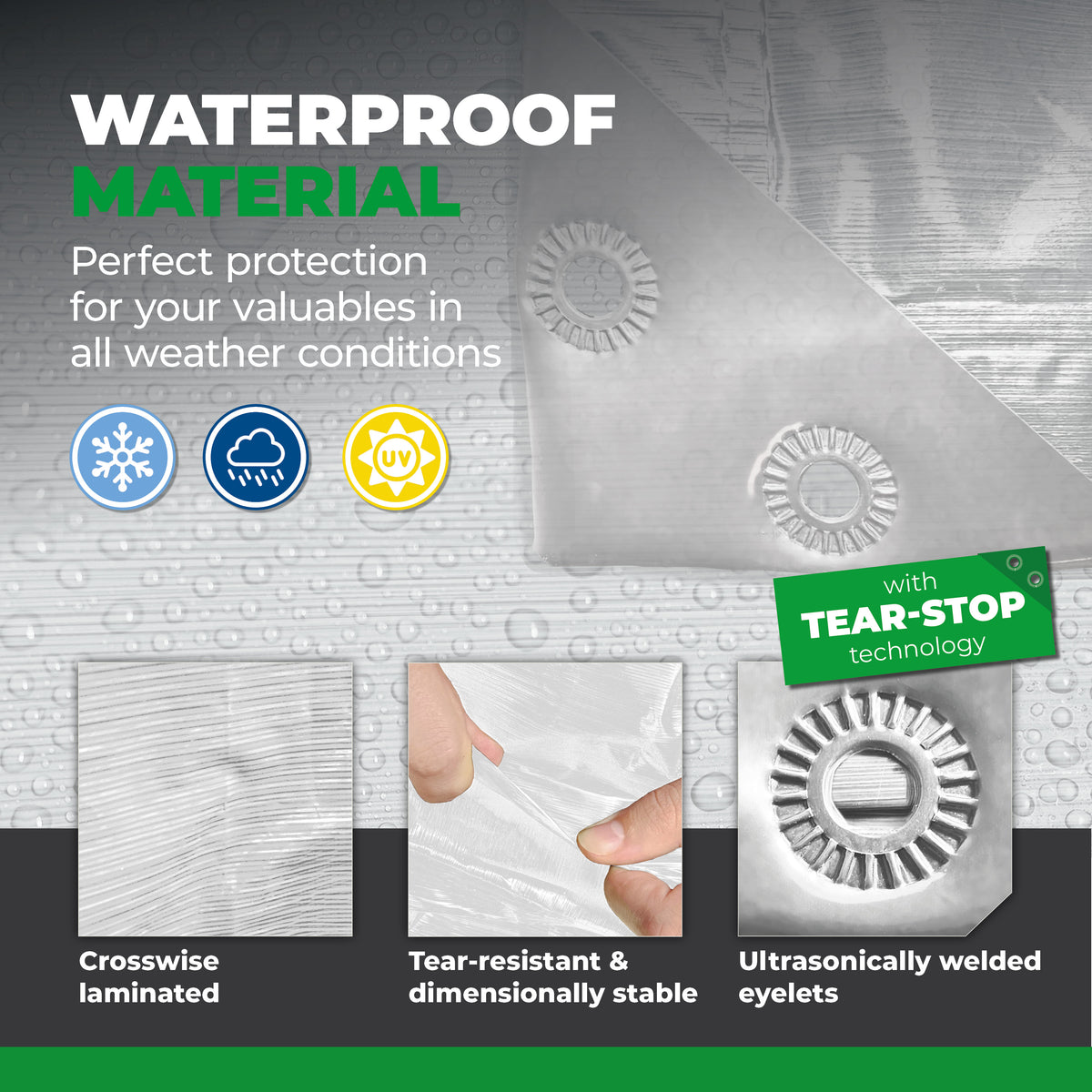 Built to be repairable, Rainexo tarps boast a 3-layer cross-laminated design that is tear-resistant, ensuring longevity and reliability. They are not only 100% frostproof but also 100% UV-stable, guaranteeing that they can withstand the harshest elements. The ultrasonically-welded eyelets not only add to their strength but also make securing your tarp a breeze.